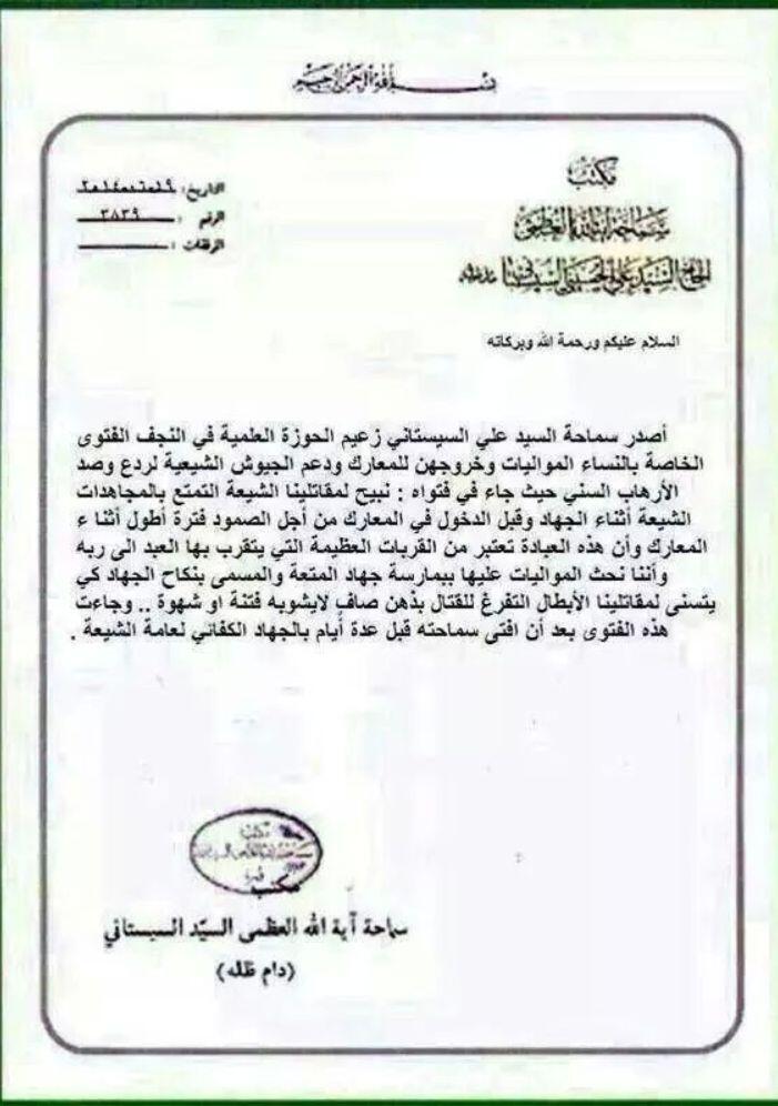 ![]() هل تستطيع ان تأتي بنفي من مكتب السستاني لهذه الوثسقة ونفي من احد مكاتب السستاني يحرم نكاح الجهاد |